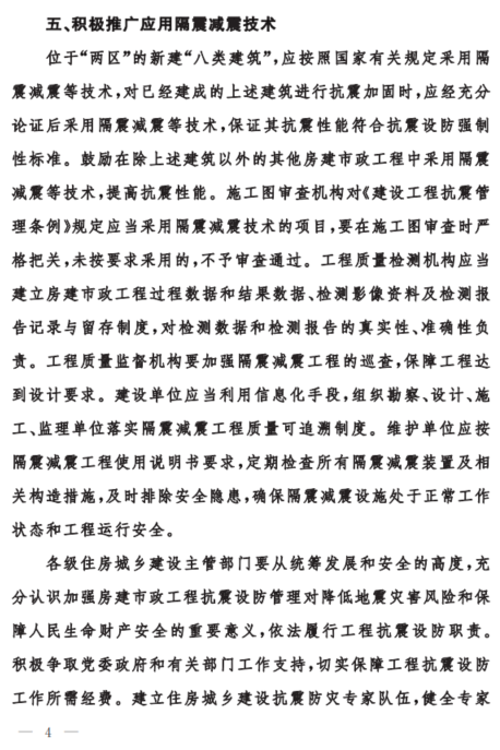 《建設(shè)工程抗震管理?xiàng)l例》(國令第 744 號(hào))第十六條:建筑工程根據(jù)使用功能以及在抗震救災(zāi)中的作用等因素,分為特殊設(shè)防類、重點(diǎn)設(shè)防類、標(biāo)準(zhǔn)設(shè)防類和適度設(shè)防類。學(xué)校、幼兒園、醫(yī)院、養(yǎng)老機(jī)構(gòu)、兒童福利機(jī)構(gòu)、應(yīng)急指揮中心、應(yīng)急避難場所、廣播電視等建筑,應(yīng)當(dāng)按照不低于重點(diǎn)設(shè)防類的要求采取抗震設(shè)防措施。位于高烈度設(shè)防地區(qū)、地震重點(diǎn)監(jiān)視防御區(qū)的新建學(xué)校、幼兒園、醫(yī)院、養(yǎng)老機(jī)構(gòu)、兒童福利機(jī)構(gòu)、應(yīng)急指揮中心、應(yīng)急避難場所、廣播電視等建筑應(yīng)當(dāng)按照國家有關(guān)規(guī)定采用隔震減震等技術(shù),保證發(fā)生本區(qū)域設(shè)防地震時(shí)能夠滿足正常使用要求。國家鼓勵(lì)在除前款規(guī)定以外的建設(shè)工程中采用隔震減震等技術(shù),提高抗震性能。 |
